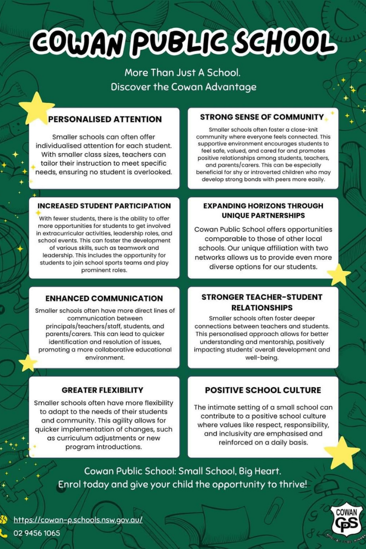 Cowan Public School is a comprehensive, co-educational public school for students from Kindergarten to Year 6, located in the heart of Cowan. We are proud to be part of a strong and inclusive public education system, welcoming students from all backgrounds, cultures and walks of life.
